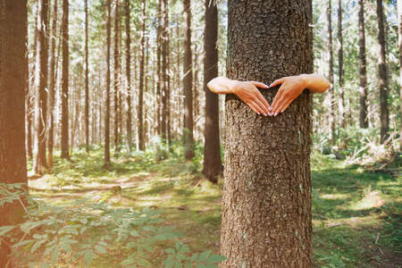 Woman hugging a tree and female hands making heart shape gesture on a trunk in summer forest. Concept of care for environment.
