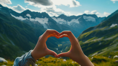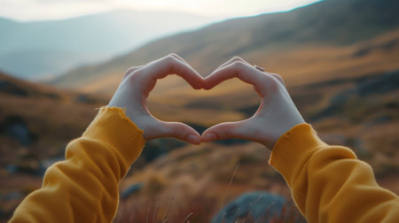 Close-up of heart-shaped hands against a backdrop of rolling hills generative ai