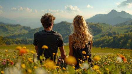 Joyful man and woman enjoying a candid moment in a wildflower meadow, exemplifying love and happiness. A.I.