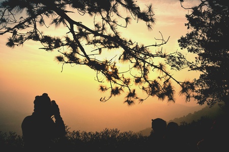 Silhouetted couple cozily nestled amidst foliage illuminated by golden backlight. Concept Outdoor Photoshoot, Silhouette Portrait, Couple Photography, Golden Hour Lighting