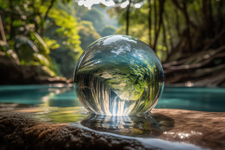 Reflective glass ball with a waterfall in the mountains