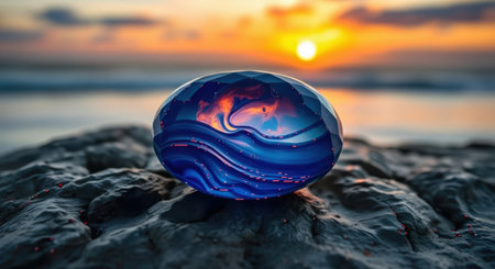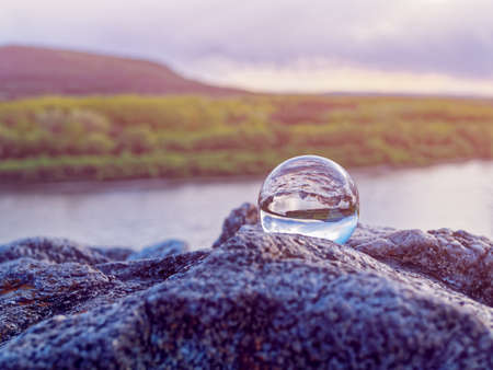 Crystal ball on rocky beach on a granite boulder, sunset reflecting in the sea, background blurred