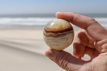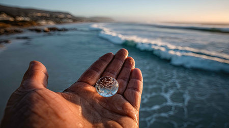 Crystal ball in the man’s hand. Original upside down view and rounded perspective of the beach near the rock. Original and engaging picture.