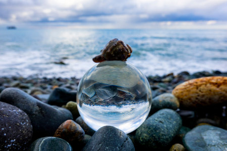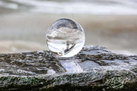 Magic sphere. Fortune teller, mind power concept. Crystal Ball reflecting water and sky.