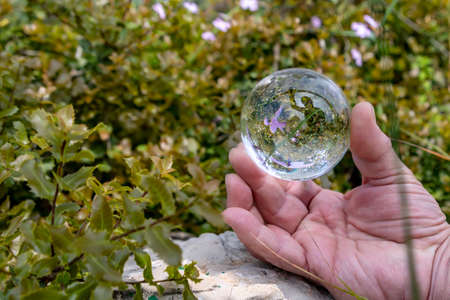 Man's hand holding a crystal ball with reflected flowers in it close up