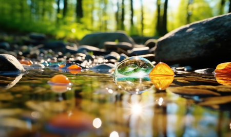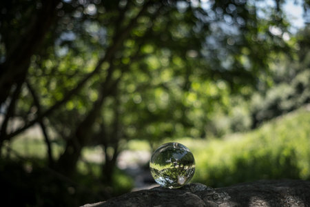 Crystal ball with tree reflection on green bokeh background in nature