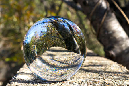 Landscape photographed through a glass sphere. There is a reflection of the landscape in a glass sphere.