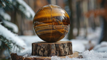 the concept of nature, green forest. Crystal ball on a wooden stump with leaves. Glass ball on a wooden stump covered with moss.