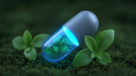 This captivating image features a futuristic capsule with vibrant plant elements, nestled among lush green leaves, showcasing the harmony of nature and science in health.