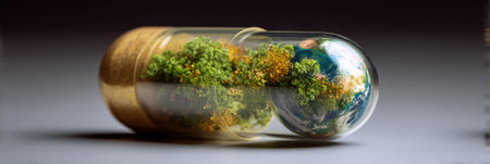 A transparent capsule encapsulates a vibrant planet Earth surrounded by thriving greenery, symbolizing eco-friendly medicine and sustainability.