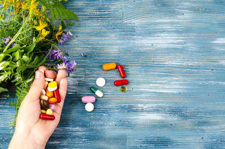 Medicine, pills and linden flowers in doctor's hands, natural medicine vs synthetic