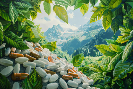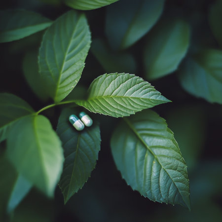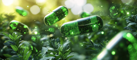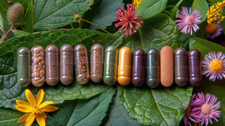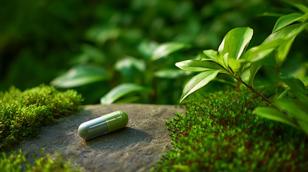 Herbal capsules rest surrounded by vibrant greenery, showcasing a serene and tranquil atmosphere that highlights nature's abundance and wellness.