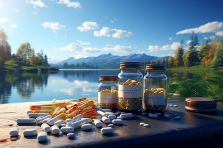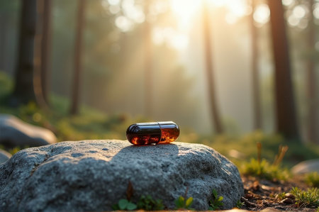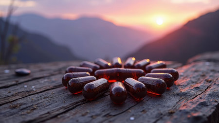 Red capsules on wooden surface at sunset in mountain landscape. That the image is generated using AI.