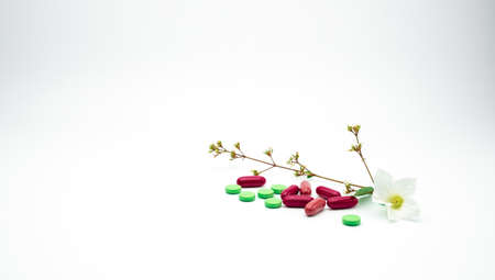 Red, green vitamin and supplement tablet and capsule pills with flower and branch on white background with copy space.