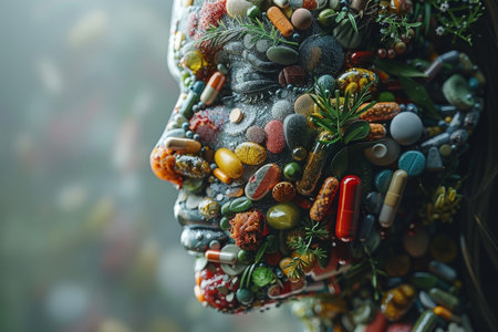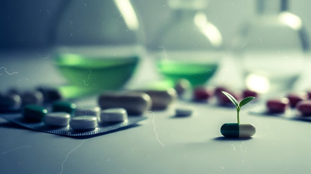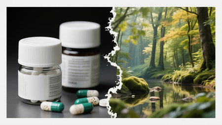 A vitamin capsule contains a small planet Earth alongside a green fern, representing the synergy of health and environmental consciousness in modern medicine.