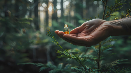 Hand holding a transparent pill containing green moss, suggesting research in innovative pharmaceutical and medical solutions