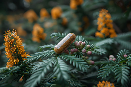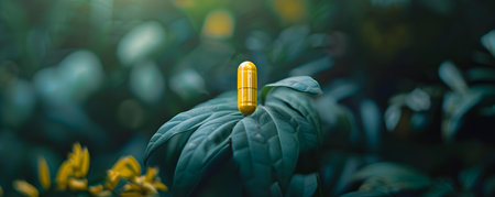 Herbal supplement capsule resting on lush green plant branches with vibrant yellow blossoms and budding flowers in a natural setting. represents organic health and wellness, nature-inspired alternative medicine, and natural ingredients. Generative AI