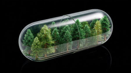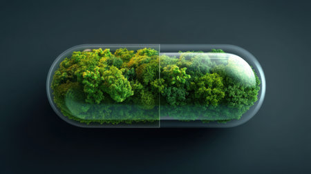 This striking image features a transparent capsule housing a vibrant forest, symbolizing the intersection of health and nature, promoting sustainability.