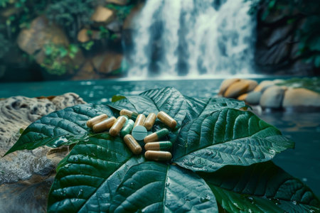 A bunch of pills are on a leaf next to a waterfall. The pills are green and yellow