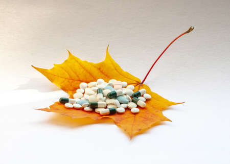 Yellow maple leaf and vitamins in the form of tablets and pills on a white background
