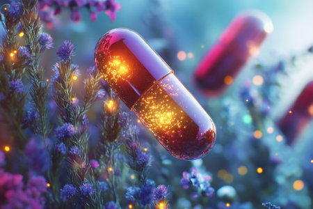 Colorful capsules hover over blooming flowers, blending natural beauty with a whimsical, dreamlike quality.