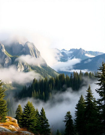 Explore a breathtaking forest landscape where majestic mountains meet lush evergreen trees, shrouded in mist, creating an atmosphere of serene tranquility.