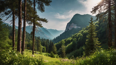 A breathtaking mountain landscape featuring lush pine trees and a clear blue sky, showcasing the tranquil beauty of nature and inviting exploration.