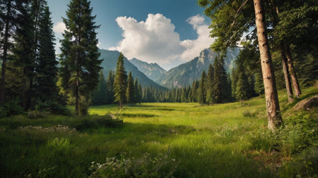 This captivating landscape features a lush forest bordered by majestic mountains under a clear blue sky. The scene captures the essence of nature's beauty and tranquility.