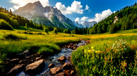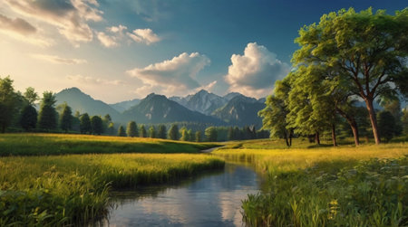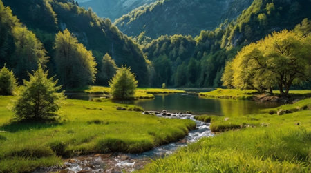 Beautiful summer mountain landscape with green meadow and mountain river.