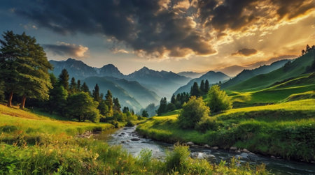 Beautiful summer landscape with mountain river and green meadow at sunset