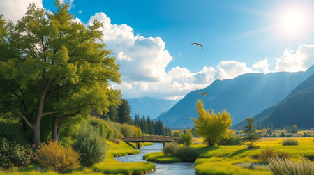 Beautiful mountain landscape with clear mountain river and blue sky with clouds