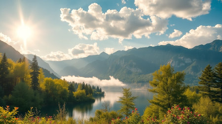 Mountain lake in the morning light. Landscape with mountain lake and forest.