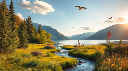 A tranquil river flows through verdant mountains, enveloped in morning mist. The serene landscape captures the essence of nature's beauty and calmness at dawn.