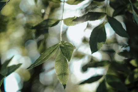 Vivid leaves of trees on bokeh background. Rich greenery in sunlight with copy space. Lush foliage close-up in sunny day. Natural green backdrop of scenic nature in backlight. Abstract texture.