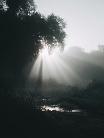 Sunlight rays break through the fog, creating a soft glow in the empty landscape with trees and a small water source during morning.