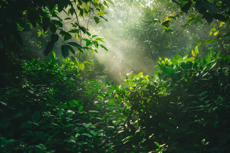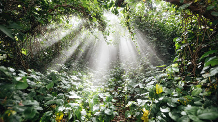 Beams of sunlight pierce through the thick canopy of a tropical rainforest, illuminating the vibrant green leaves and creating an enchanting atmosphere.