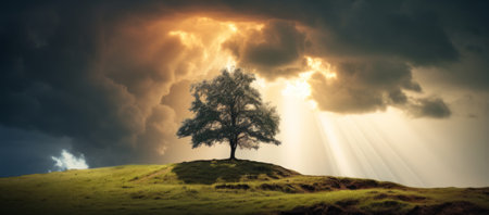 single tree on hill with dramatic clouds and thunderstorm