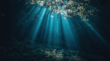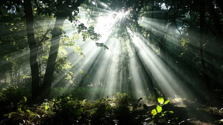 Sunbeams pierce a mystical forest, illuminating lush greenery. Peaceful nature.
