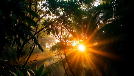Bright rays of sunlight pierce through the lush greenery of a rainforest, illuminating the misty air and revealing diverse plant life in the serene morning atmosphere.