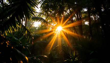 Golden rays through peaceful jungle trees