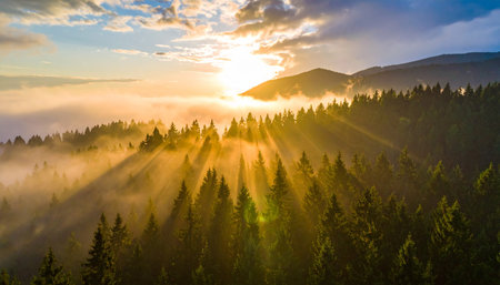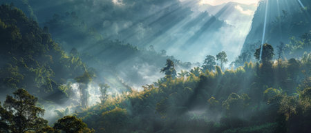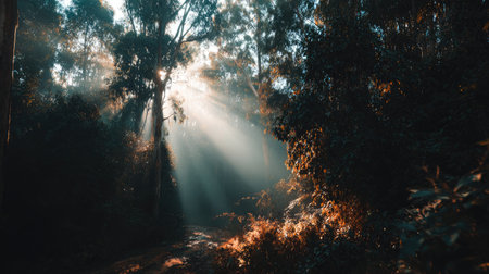A stunning display of sunlight streaming through trees creates a serene atmosphere in a misty forest landscape. This captivating scene embodies tranquility and natural beauty.