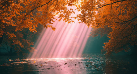 Golden light streams through vibrant fall leaves, casting a magical glow on a serene watercourse.