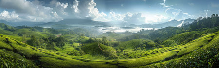 A lush green sprawling valleys beneath towering mountains in the background, creating a stunning landscape.