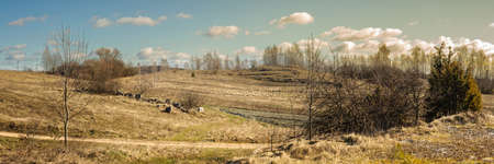 wide panoramic view of the early spring or late autumn hilly field with dry grass on the slopes, bare trees and a rural road under a cloudy sky. beautiful countryside landscape with seasonal features