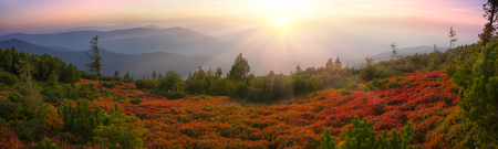 Ukraine. Sunrise shines in the Carpathians, colored fog spreads over the valleys and lowlands of the mountain range, golden prairies are very dazzlingly beautiful.