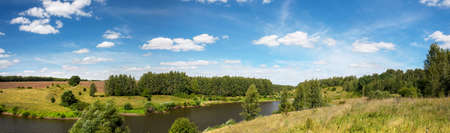 Summer rural panoramic landscape with beautiful river and green forest in sunny day