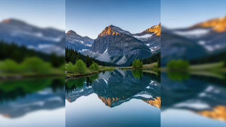 Collage of alpine lake and mountains reflected in water at sunset