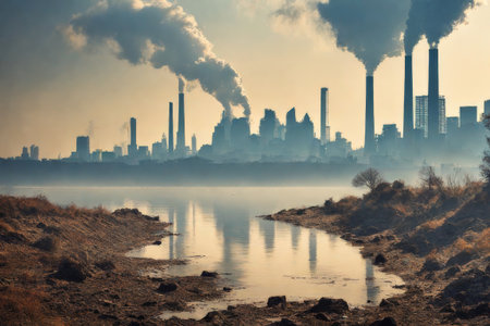 A gloomy industrial scene featuring smoke stacks and reflections in polluted water. The image highlights environmental issues related to industry.