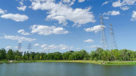 Summer landscape picturesque green forest with green trees power lines passing through them