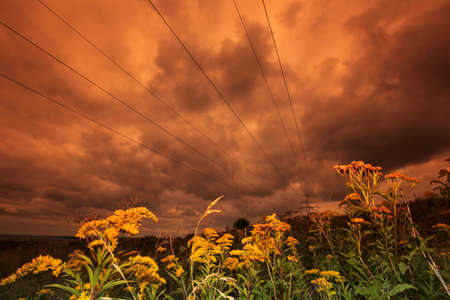 Beautiful autumn field with grass and wildflowers on background of electricity tower with power lines in sunset sky. Wild grass and herbs in fall meadow in evening sunlight. Tranquility